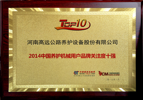 1月20日,中国路面机械网和工程机械电商网在北京发布了《2014中国工程机械用户品牌关注度TOP10排行榜》,高远圣工再次荣膺“2014年中国养护机械用户品牌关注度十强”。